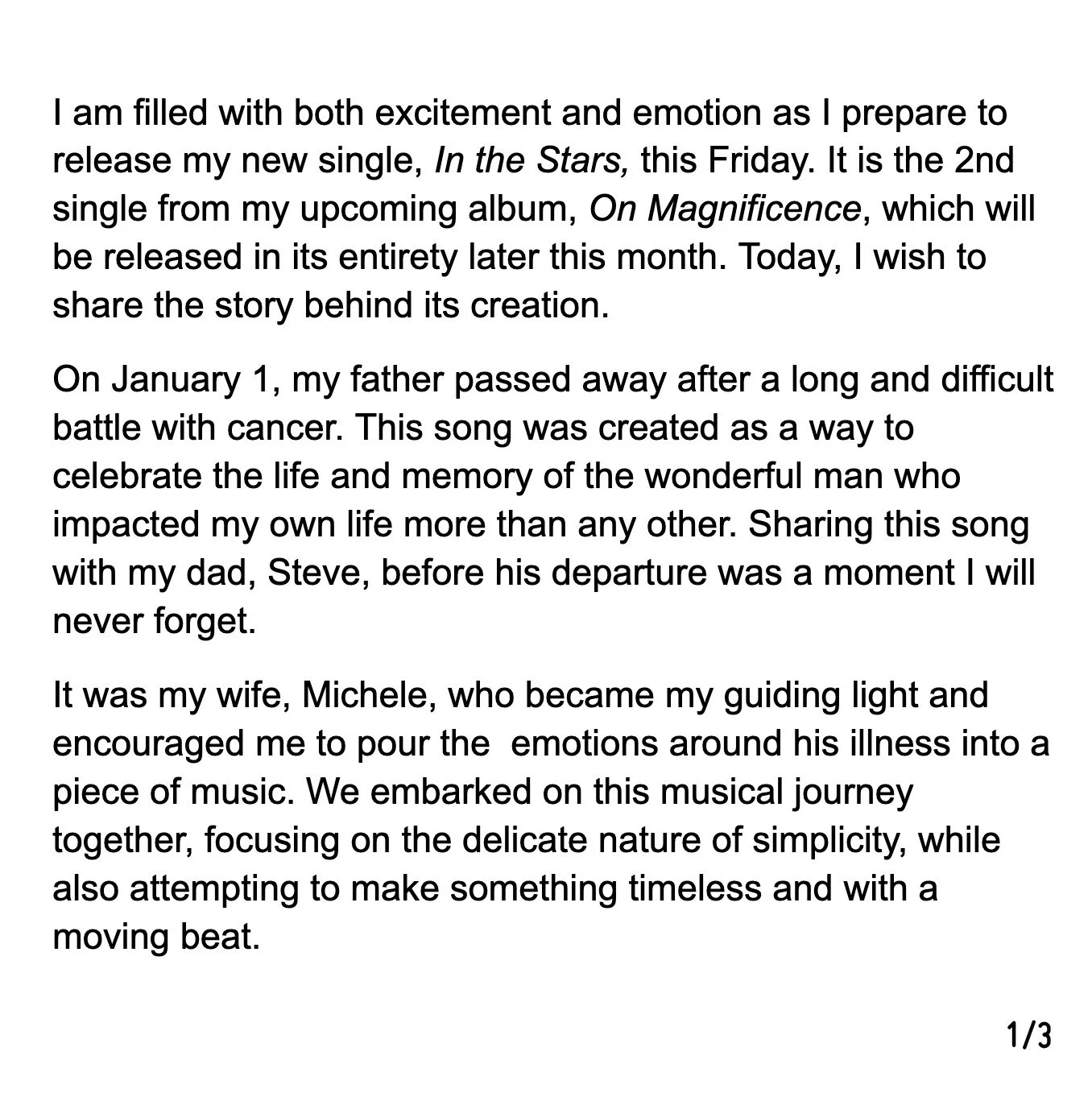 On Magnificence, released in June 2023, is one of the most collaborative projects I have created. The album explores different expressions of awe, from nature and imagination to human connection. It feels like a collection of short musical stories, each capturing a different shade of wonder while still forming a unified whole. This album was also written during and after the passing of my father, Stephen. “In the Stars” was written in his honor and was a collaboration with my wife, Michele (aka Me~She)